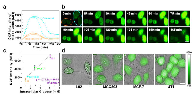 圖2. 肝癌細(xì)胞和正常肝細(xì)胞的熒光強度變化圖(a)以及對應(yīng)的共聚焦系統(tǒng)圖像(b);(c)不同細(xì)胞胞內(nèi)葡萄糖濃度和檢測熒光強度的關(guān)系;各細(xì)胞熒光強度達到峰值時的細(xì)胞圖像(d)。