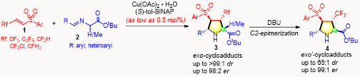 采用商業(yè)易得(S)-tol-BINAP/Cu(OAc)2配合物作為催化劑,含不同取代基的亞胺酸酯及含氟烷基不飽和砜都可以在此類反應中得到應用。最終,以最高97%產率,大于99:1的非對映選擇性比例(exo:endo)和98:2的對映選擇性比例得到多種含氟烷基手性四氫吡咯化合物。該反應可以擴大至克級反應規(guī)模,催化劑用量可以降低至0.5 mol%。尤其重要的是,exo型催化產物經DBU簡單處理后可得到其差向異構體(exo’),實現了非對映發(fā)散式合成。該課題組還進一步與我校材料科學與工程國際化示范學院趙焱教授合作,通過密度泛函理論(DFT)和非共價鍵相互作用(NCI)計算方法,對此反應的反應歷程和優(yōu)勢立體選擇性誘導機制進行了解釋,并提出了可能的反應機理。論文發(fā)表在化學領域頂級期刊《Angew. Chem. Int. Ed. 2019, 58, 16637–16643; IF:12.102》,第一作者為博士研究生程豐,黃毅勇教授為第一通訊作者,材料科學與工程國際化示范學院趙焱教授完成了理論計算部分,為共同通訊作者。