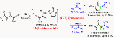 黃毅勇教授課題組還基于目前亞胺與聯(lián)烯之間的親核性催化反應體系只涉及兩性離子反應中間體的研究現狀,突破現有反應模式,創(chuàng)新性的提出用噁唑烷酮衍生的聯(lián)烯酰亞胺代替聯(lián)烯基酯,在叔膦催化劑作用下生成手性雙親電性中間體,最終實現首例聯(lián)烯與亞胺、烯胺和酰胺之間的[4 + 1]環(huán)加成反應,分別構建了全取代烯胺酮、含全碳手性中心的β-酮亞胺及γ-內酰胺等重要骨架分子,將為發(fā)展一系列聯(lián)烯酰亞胺與不同類型雙親核試劑的不對稱[4 + n]環(huán)加成反應及一些天然產物的簡潔合成奠定重要基礎。論文同樣發(fā)表在化學領域頂級期刊《Angew. Chem. Int. Ed. 2019, ASAP, DOI: 10.1002/anie.201912263》,第一作者為碩士研究生曹澤混,黃毅勇教授為唯一通訊作者。