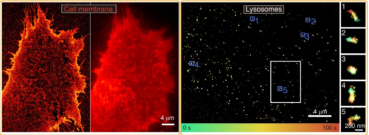 此外,為了在活細(xì)胞水平上驗(yàn)證季銨化染料的成像優(yōu)勢,進(jìn)一步開發(fā)了兩種針對亞細(xì)胞器標(biāo)記的探針,即細(xì)胞膜探針(Mem-R)和溶酶體探針(Lyso-R)。二者均在活細(xì)胞靶標(biāo)位置展現(xiàn)出閃爍的單分子信號特征?;谶@些閃爍的單分子信號,成功地對活細(xì)胞的細(xì)胞膜和溶酶體進(jìn)行了定位型超分辨成像(圖2)。