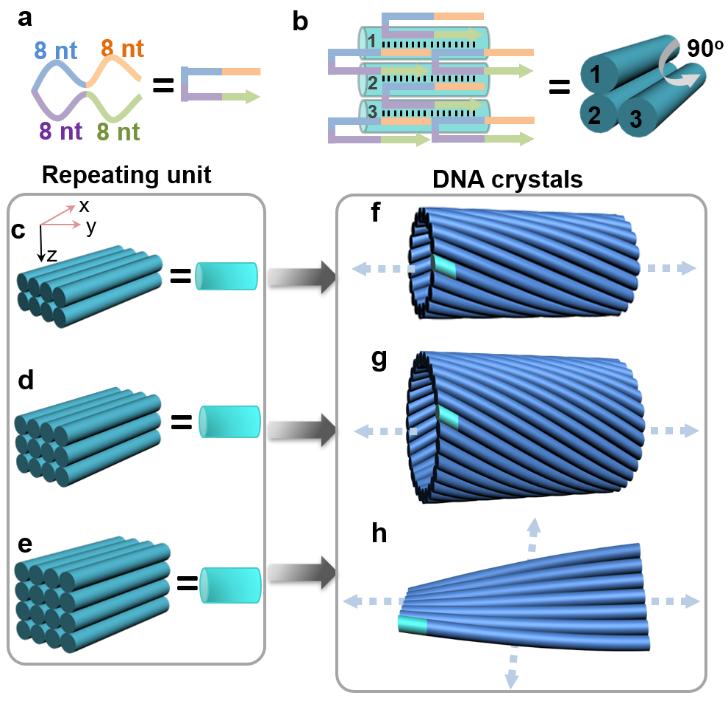 聚焦此問題,西安交通大學(xué)醫(yī)學(xué)部基礎(chǔ)醫(yī)學(xué)院生物化學(xué)與分子生物學(xué)團隊對于大尺寸DNA納米管自組裝進(jìn)行了深入研究,并取得了重大突破。研究發(fā)現(xiàn)通過對DNA結(jié)構(gòu)重復(fù)單元的剛性和曲率進(jìn)行調(diào)節(jié),可以構(gòu)建不同直徑的納米管,范圍可從50 nm 調(diào)節(jié)至550 nm。實驗結(jié)果表明,剛性大、曲率小的DNA結(jié)構(gòu)重復(fù)單元有利于大直徑納米管的生成。同時DNA雙鏈扭轉(zhuǎn)密度的調(diào)節(jié)實現(xiàn)了納米管手性的控制,為納米材料構(gòu)建手性支架平臺奠定了良好的基礎(chǔ)。