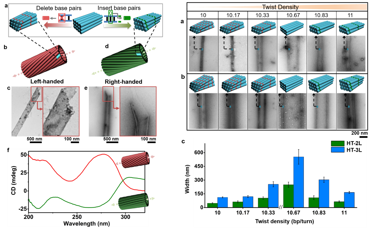 圖2 (左)手性可控的DNA納米管自組裝。(右)通過厚度和扭曲密度的控制可實現(xiàn)不同尺寸的DNA納米管構(gòu)建。