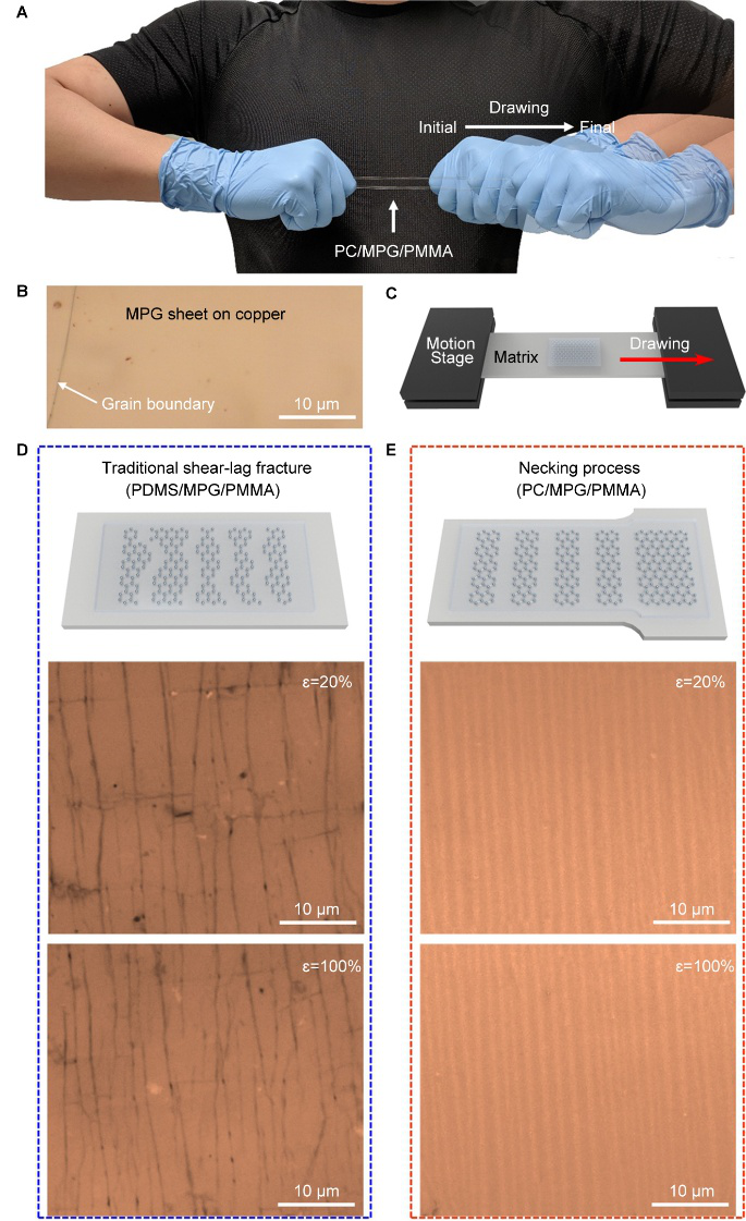 基于以上想法,團(tuán)隊聯(lián)想到了在熱塑性聚合物加工領(lǐng)域的頸縮工藝。該頸縮工藝是指在外加拉應(yīng)力作用下,熱塑性聚合物發(fā)生局部的頸縮現(xiàn)象,這種局部頸縮會在持續(xù)的拉應(yīng)力作用下移動,且伴有強(qiáng)烈的局域應(yīng)變,使得頸縮經(jīng)過的部分寬度和厚度減小,長度延長,最終擴(kuò)展到整層聚合物。受此過程中動態(tài)傳播的局域應(yīng)變的啟發(fā),團(tuán)隊設(shè)計了一種三明治結(jié)構(gòu)的單層多晶石墨烯及聚合物的復(fù)合體-聚碳酸酯/多晶石墨烯/聚甲基丙烯酸甲酯-并對其進(jìn)行了簡便的頸縮工藝處理,最終觀察到了一個非常有趣的現(xiàn)象:在頸縮未經(jīng)過的部分,石墨烯保持原貌;在頸縮經(jīng)過之后,石墨烯斷裂成有序且寬度一致的納米尺寸條帶。在整個過程中,石墨烯的斷裂伴隨著頸縮的傳播而有序的發(fā)生。