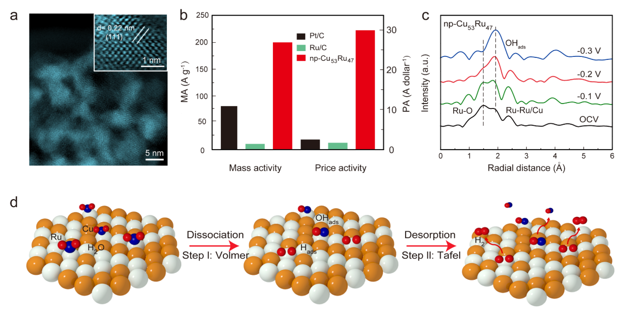 為此,譚勇文教授團(tuán)隊(duì)通過(guò)傳統(tǒng)冶金技術(shù)結(jié)合脫合金工藝,制備出不同比例的三維納米多孔Cu-Ru合金。得益于多孔合金的高比表面積以及合金原子的協(xié)同作用,作為堿性電催化析氫催化劑,Ru-Cu合金(np-Cu53Ru47)表現(xiàn)出比商用Pt/C催化劑更高的活性和耐久性。團(tuán)隊(duì)進(jìn)一步采用原位同步輻射表征和理論模擬計(jì)算等手段對(duì)納米多孔銅釕合金在真實(shí)催化條件下進(jìn)行系統(tǒng)的研究,發(fā)現(xiàn)釕原子摻入銅基體中,調(diào)制了合金的電子結(jié)構(gòu),不僅加快了水分子吸附和活化的反應(yīng)步驟,還優(yōu)化銅位點(diǎn)及釕位點(diǎn)對(duì)氫中間體的吸附-解吸能壘。這項(xiàng)工作不僅成功地合成了雙金屬合金并系統(tǒng)的研究其催化活性來(lái)源,而且為實(shí)現(xiàn)廉價(jià)而有效的能量轉(zhuǎn)換系統(tǒng)開(kāi)辟了道路。