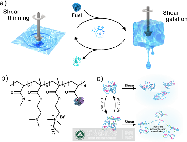 雖然納米生物基懸浮液常用于制備剪切增稠液,但是存在修飾難、透明度差以及易相分離等問題。為此,他們采用疏水締合聚合物來代替納米基懸浮液,并控制聚合物分子量以及疏水改性取代度,實(shí)現(xiàn)高剪切速率誘導(dǎo)下的疏水聚電解質(zhì)分子間交聯(lián),達(dá)到剪切增稠的目的。同時(shí),利用耗散熱力學(xué)(dissipation-control)而非經(jīng)典熱力學(xué)原理(thermal equilibrium-control),通過尿素-脲酶反應(yīng)控制體系pH變化,進(jìn)一步誘導(dǎo)聚合物線團(tuán)構(gòu)象隨時(shí)間變化,實(shí)現(xiàn)了非牛頓流體能夠自發(fā)在剪切變稀與剪切增稠兩種截然不同現(xiàn)象之間轉(zhuǎn)換(圖1)。