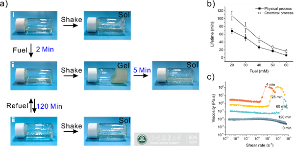 由于采用耗散熱力學(xué)機(jī)理,聚合物非牛頓流體內(nèi)部組裝結(jié)構(gòu)及宏觀性質(zhì)隨時(shí)間變化,而非表現(xiàn)為通常熱力學(xué)平衡態(tài)刺激響應(yīng)。具體來看,體系必須依托外界能量的持續(xù)輸入才能表現(xiàn)出剪切增稠的性能,一旦失去能量供給或能量消耗,體系又立即表現(xiàn)出剪切變稀的行為。如圖2所示,隨著時(shí)間的推移,我們可以觀察到震蕩變稀以及震蕩成膠兩種截然不同的流體特征。如果進(jìn)一步控制尿素緩沖液(化學(xué)能)的使用濃度,我們則可以有效控制剪切場(chǎng)(物理能量)下的非線性力學(xué)性能短暫存在的時(shí)間。