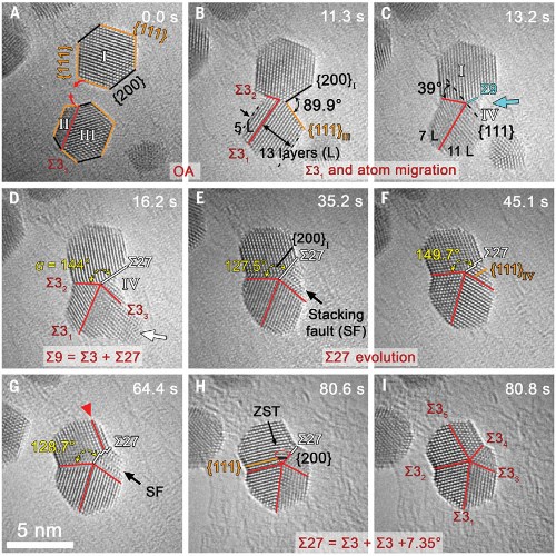 圖1. 五重孿晶形成機理1:通過取向粘附、原子表面擴散以及隨后的高能晶界的形成和分解(零應變孿晶成核和生長)