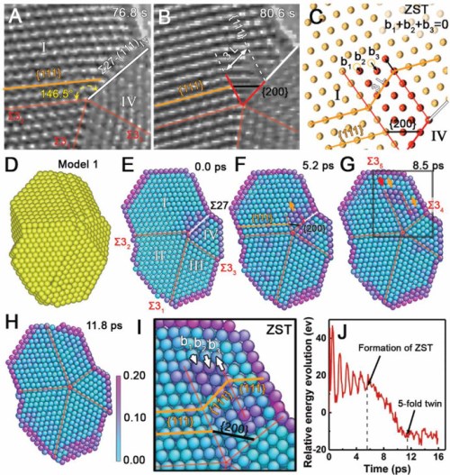作為一種重要的孿晶結(jié)構(gòu),五重孿晶在晶體生長、生物醫(yī)學、光學和催化等領域均有著廣泛的應用。比如,五重孿晶結(jié)構(gòu)所引入的晶格畸變可以增加納米線的楊氏模量;五重孿晶銅納米線在還原CO2制備甲醇的過程中表現(xiàn)出優(yōu)異的催化性能等。盡管自G. Rose于1831年在金中發(fā)現(xiàn)五重孿晶以來,科研人員已在近百種材料中發(fā)現(xiàn)了五重孿晶結(jié)構(gòu)并開展了大量的基礎和應用研究,但由于無法在原子尺度直接觀察形成過程,其形成機理至今仍無定論。