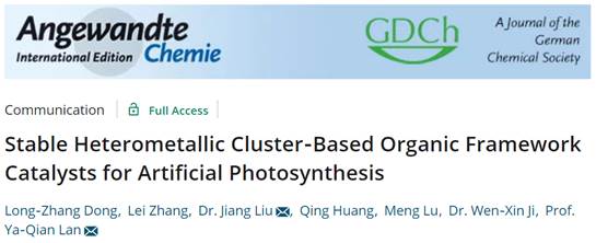 近日,南京師范大學(xué)化科院蘭亞乾教授課題組在人工光合作用催化劑研究方面取得重要進(jìn)展。該研究成果以Stable Heterometallic Cluster‐Based Organic Frameworks Catalysts for Artificial Photosynthesis為題發(fā)表于Angew. Chem. Int. Ed.(http://doi.org/10.1002/anie.201913284)。Angew. Chem. Int. Ed.雜志是Wiley公司的王牌雜志,也是化學(xué)學(xué)科頂級(jí)期刊。