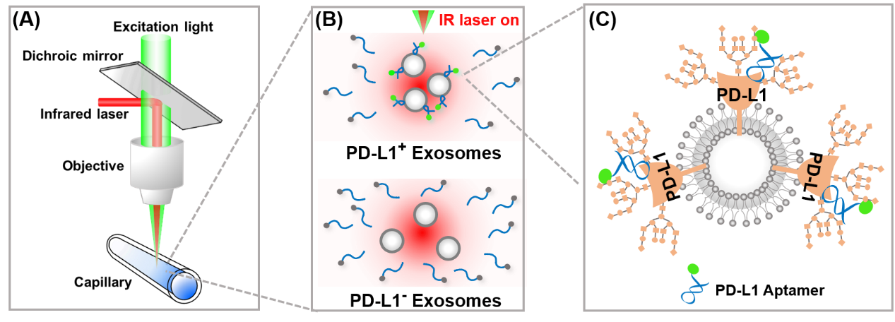 針對(duì)這一挑戰(zhàn),楊朝勇課題組結(jié)合篩選獲得的PD-L1核酸適體及微量熱泳動(dòng)效應(yīng),發(fā)展了一種均相、小體積、高效、靈敏的外泌體PD-L1定量檢測方法HOLMES-ExoPD-L1(homogeneous, low-volume, efficient, and sensitive exosomal PD-L1)。與經(jīng)典組織活檢相比,基于外泌體PD-L1的液體活檢技術(shù)具有判斷準(zhǔn)確、預(yù)測周期短、侵入性小、取樣方便等優(yōu)勢。該方法采用PD-L1核酸適體為識(shí)別分子,相比于抗體,適體體積更小易于穿過PD-L1糖基化修飾,從而提高PD-L1識(shí)別效率。在熱泳動(dòng)效應(yīng)下,適體與PD-L1外泌體結(jié)合復(fù)合物、適體在溫度場下具有不同分布,從而無需分離洗滌即可對(duì)外泌體PD-L1實(shí)現(xiàn)定量檢測。由于靈敏度的顯著提高, HOLMES-ExoPD-L1可有效區(qū)分癌癥患者和健康人。同時(shí),通過對(duì)大量臨床品的研究,團(tuán)隊(duì)發(fā)現(xiàn)腺癌患者外泌體PD-L1濃度與腫瘤轉(zhuǎn)移呈正相關(guān)。Sherlock Holmes(夏洛克·福爾摩斯)是小說中的破案高手,課題組希望所發(fā)展的HOLMES-ExoPD-L1方法能對(duì)“癌癥產(chǎn)生的蛛絲馬跡”進(jìn)行精準(zhǔn)分析,為早期癌癥診斷和免疫療法響應(yīng)預(yù)測提供技術(shù)手段。