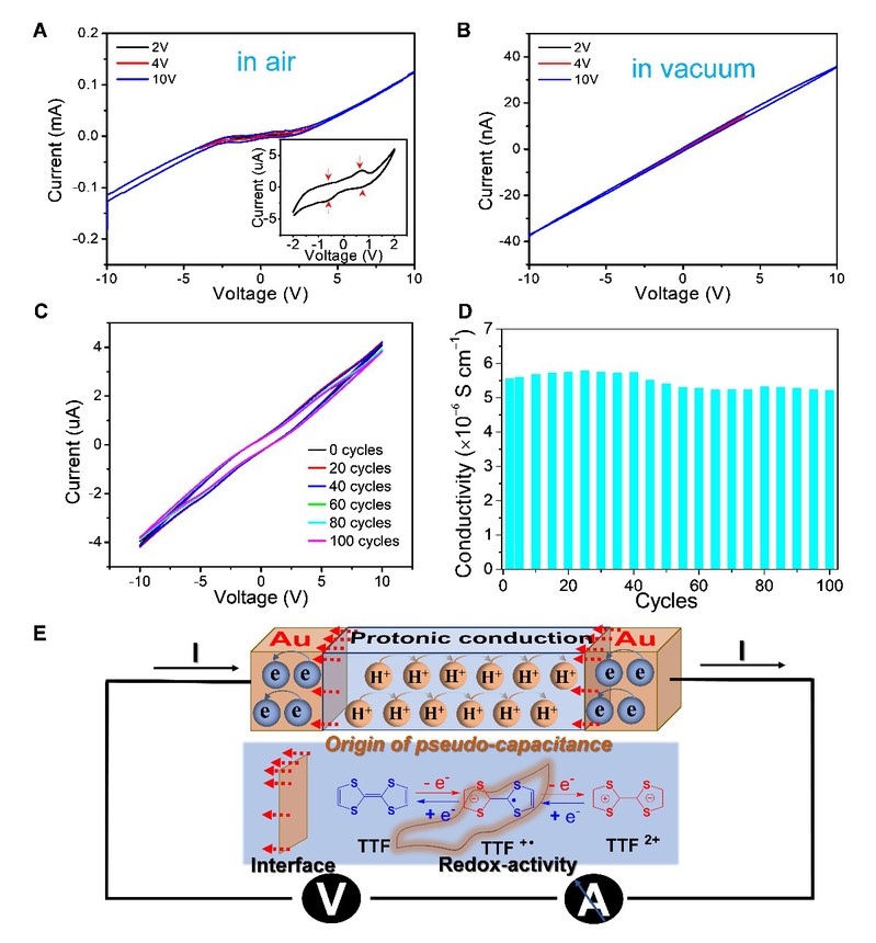 兼具電子導(dǎo)電性和離子導(dǎo)電性的多孔金屬有機(jī)框架材料可能為新型燃料電池的設(shè)計(jì)、綠色能源技術(shù)以及半導(dǎo)體相關(guān)領(lǐng)域帶來(lái)新的機(jī)遇和發(fā)展。以上研究團(tuán)隊(duì)密切合作,在拓?fù)渲笇?dǎo)合成的基礎(chǔ)上,通過(guò)羧基基團(tuán)的空間安置,利用四硫富瓦烯苯八羧酸配體(H8TTFOC)定向制備了一個(gè)具有高質(zhì)子導(dǎo)電性的二維金屬有機(jī)框架材料In-TTFOC(1.30 × 10?2 S cm?1 , 303 K, 98% RH)(圖1)。通過(guò)單晶X-射線衍射和變溫質(zhì)子導(dǎo)電研究等手段,證明In-TTFOC中更高的質(zhì)子導(dǎo)電性來(lái)源于孔道中大量水分子、二甲銨陽(yáng)離子和未配位羧基基團(tuán)之間的協(xié)同作用,其質(zhì)子導(dǎo)電機(jī)理為Grotthuss機(jī)理。他們?cè)谶M(jìn)一步研究In-TTFOC的電子導(dǎo)電行為時(shí)發(fā)現(xiàn),該材料的質(zhì)子導(dǎo)電可以完全轉(zhuǎn)化為總電路的電子導(dǎo)電。通常情況下離子導(dǎo)電材料(如PEDOT等)與金屬電極的接觸界面會(huì)限制質(zhì)子的進(jìn)一步傳導(dǎo),因此單純離子導(dǎo)電性需通過(guò)特殊機(jī)制實(shí)現(xiàn)進(jìn)一步的界面電荷傳遞,最終轉(zhuǎn)化成為總電路導(dǎo)電行為。通過(guò)固體電化學(xué)研究以及非線性I-V曲線的潛在關(guān)聯(lián),該研究團(tuán)隊(duì)指出In-TTFOC結(jié)構(gòu)中具有氧化還原活性的TTF配體在界面電荷傳輸過(guò)程中發(fā)揮了重要作用,即具有電化學(xué)活性的TTF構(gòu)筑基元在金電極與樣品接觸的界面可通過(guò)其自身氧化還原提供法拉第電流(即配體誘導(dǎo)贗電容)(圖2)?;诖?,他們?cè)诒疚闹刑岢隽诵路f的“離子導(dǎo)電/贗電容耦合”機(jī)理,解釋了二維金屬有機(jī)框架材料與金屬電極界面上的電荷轉(zhuǎn)移過(guò)程,這一機(jī)理為后續(xù)導(dǎo)電配合物多孔材料和器件的設(shè)計(jì)提供了理論指導(dǎo)意義。該類同時(shí)具備有效的質(zhì)子和電子傳導(dǎo)的二維配合物材料可應(yīng)用于新型功能電子器件、神經(jīng)形態(tài)以及能源轉(zhuǎn)化或存儲(chǔ)器件中。