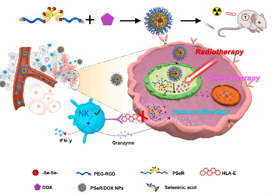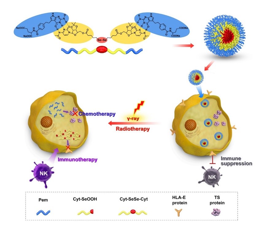 近日,清華大學(xué)的許華平教授團(tuán)隊(duì)發(fā)展了一系列含硒納米藥物,將癌癥免疫治療與化療、放療相結(jié)合,顯著提高了免疫治療的抗腫瘤活性,為癌癥聯(lián)合療法的設(shè)計(jì)提供了新的策略。含胞嘧啶的二硒化合物(Cyt-SeSe-Cyt)可以與癌癥臨床治療中常用的化療藥物培美曲塞形成共組裝體。在臨床化療中常用的5 Gy低劑量伽馬射線輻照下,二硒鍵會(huì)發(fā)生斷裂生成亞硒酸,抑制癌細(xì)胞表面人類白細(xì)胞抗原E(HLA-E)的表達(dá),進(jìn)而阻斷自然殺傷(NK)細(xì)胞的抑制性免疫檢查點(diǎn),從而提高NK細(xì)胞殺傷活性。與此同時(shí),三重氫鍵也會(huì)發(fā)生斷裂,使得化療藥物培美曲塞從組裝體中釋放,發(fā)揮其抗腫瘤效果。相關(guān)成果以“Diselenide-Pemetrexed Assemblies for Combined Cancer Immuno-, Radio-, and Chemotherapies”為題發(fā)表在Angewandte Chemie International Edition, 2020, 59, 2700-2704。許華平教授和高世乾博士為本文共同通訊作者,清華大學(xué)博士生李天予和潘爍炯為共同第一作者。