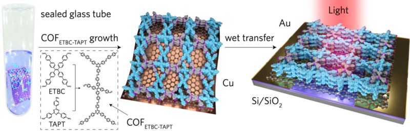 二維共價有機框架材料(2D-COFs)是一種具有可設計的π電子骨架和高度有序的拓撲結構的多孔二維層狀材料,其具有許多突出的性能,包括高的熱穩(wěn)定性,永久的孔隙率,大的比表面積,低的質量密度等。2D-COFs的光電特性可通過選擇合適的單體組合來進行編輯。然而,2D-COFs通常是各向異性生長的,以固體粉末的形式存在,很難可靠地集成到器件中。