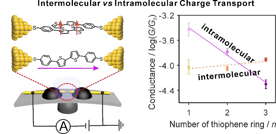 該工作采用機(jī)械可控裂結(jié)技術(shù)通過(guò)分別構(gòu)建模擬分子鏈內(nèi)輸運(yùn)的單分子器件和模擬分子鏈間輸運(yùn)的雙分子組裝體器件。研究發(fā)現(xiàn),噻吩單分子器件通過(guò)分子鏈內(nèi)的電輸運(yùn)過(guò)程中電導(dǎo)隨分子長(zhǎng)度增加呈指數(shù)降低,而噻吩組裝體器件分子間通過(guò)分子鏈間電輸運(yùn)過(guò)程電導(dǎo)基本不隨分子共軛結(jié)構(gòu)及長(zhǎng)度的變化而改變。表明在單分子尺度,分子鏈間輸運(yùn)甚至可以提供比分子鏈內(nèi)輸運(yùn)更高效的電傳輸途徑。通過(guò)分析不同共軛長(zhǎng)度噻吩分子形成雙分子組裝體器件的概率,發(fā)現(xiàn)其隨著分子共軛長(zhǎng)度的增加而提高,證明噻吩分子共軛區(qū)域的增大提升了分子鏈間組裝概率。該工作通過(guò)在單分子尺度構(gòu)筑模型分子體系,揭示了噻吩類衍生物分子結(jié)構(gòu)與其電輸運(yùn)性質(zhì)之間的構(gòu)效關(guān)系,為理解聚集態(tài)有機(jī)半導(dǎo)體材料的電輸運(yùn)過(guò)程提供了獨(dú)特的視角,也為構(gòu)筑基于分子鏈間電輸運(yùn)作用的新型分子器件開拓了思路。