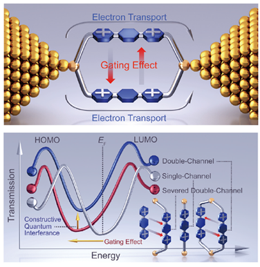 基于上述工作發(fā)展的分子鏈間電輸運(yùn)表征技術(shù),洪文晶教授課題組與諾貝爾獎(jiǎng)得主、美國(guó)西北大學(xué)Fraser Stoddart教授合作,在研究帶電大環(huán)分子體系的量子干涉效應(yīng)中發(fā)現(xiàn),雙通道帶電大環(huán)分子體系的兩條分子鏈間能夠發(fā)生強(qiáng)靜電相互作用,而這一強(qiáng)靜電相互作用可以有效調(diào)控由通過(guò)兩條分子鏈內(nèi)電輸運(yùn)的相長(zhǎng)量子干涉效應(yīng),從而實(shí)現(xiàn)相對(duì)單條分子鏈電輸運(yùn)超過(guò)50倍的電導(dǎo)增強(qiáng)。這一研究成果驗(yàn)證了分子鏈間非化學(xué)鍵的強(qiáng)靜電相互作用能顯著調(diào)控相消量子干涉效應(yīng),提出了分子鏈間強(qiáng)靜電相互作用的單分子器件“自門控(self-gating)”設(shè)計(jì)新思路。