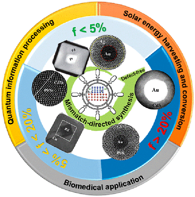 異質(zhì)納米晶以納米或量子尺度的金屬或半導(dǎo)體材料做為基元構(gòu)件,在催化、能量轉(zhuǎn)化與存儲(chǔ)、光電器件、生物醫(yī)學(xué)診斷與治療、量子信息處理等領(lǐng)域具有重要的應(yīng)用前景。大量研究表明,不同基元構(gòu)件之間異質(zhì)界面的晶格結(jié)構(gòu)與電子特性對(duì)異質(zhì)納米晶的整體性能具有關(guān)鍵性作用,其深層原因是界面處晶格失配度的大小從熱力學(xué)上決定了晶體生長(zhǎng)的不同機(jī)制。因此,晶格失配度是異質(zhì)納米晶合成與應(yīng)用中的一項(xiàng)重要參數(shù),其不僅與異質(zhì)納米晶合成的難易程度密切相關(guān),同時(shí)會(huì)對(duì)所合成材料界面處的晶格缺陷及晶格應(yīng)變狀態(tài)產(chǎn)生直接影響,從而可進(jìn)一步用于調(diào)控異質(zhì)納米晶的電子與光學(xué)特性。