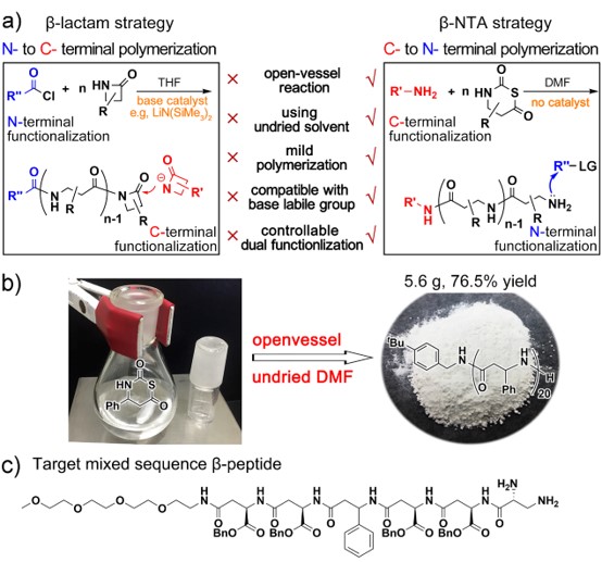 多肽在生命體中發(fā)揮著重要的生物學(xué)功能,是醫(yī)藥、組織工程、生物材料、生物學(xué)、化學(xué)等諸多領(lǐng)用的重要研究對(duì)象。但是,多肽本身結(jié)構(gòu)不穩(wěn)定,容易被蛋白酶水解,在應(yīng)用上受到很大限制。β多肽由β氨基酸構(gòu)成,與天然多肽結(jié)構(gòu)非常相似,具有突出的生物相容性和耐蛋白酶水解的優(yōu)點(diǎn),在上述多肽的各個(gè)研究領(lǐng)域備受關(guān)注。β多肽的合成,除了傳統(tǒng)耗時(shí)耗力的逐步固相合成法,強(qiáng)堿性反應(yīng)環(huán)境下的β-內(nèi)酰胺開環(huán)聚合是目前最常用的β多肽快速合成方法。但是,β-內(nèi)酰胺開環(huán)聚合的強(qiáng)堿性反應(yīng)環(huán)境限制了對(duì)堿不穩(wěn)定的功能基團(tuán)和β多肽的結(jié)構(gòu)多樣性和應(yīng)用,且聚合反應(yīng)對(duì)水極為敏感,需要使用干燥溶劑在手套箱中操作。