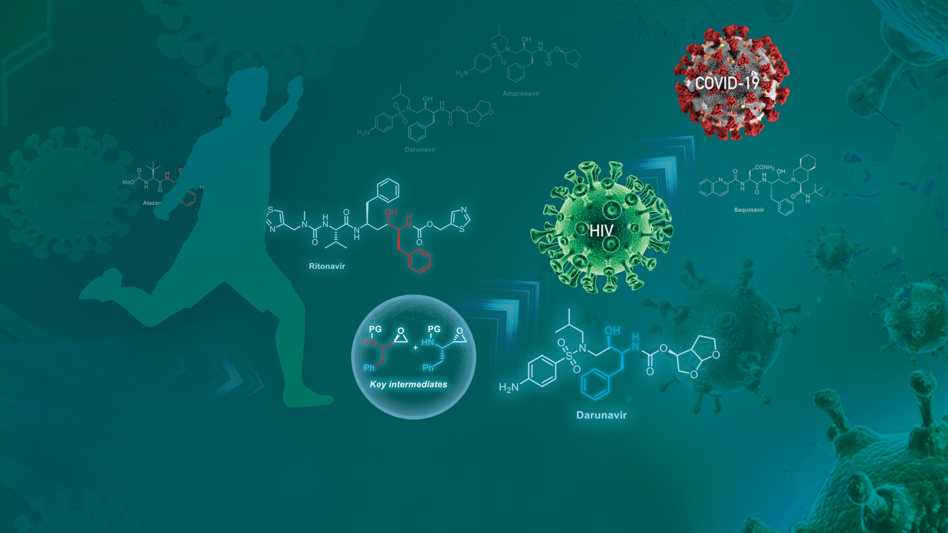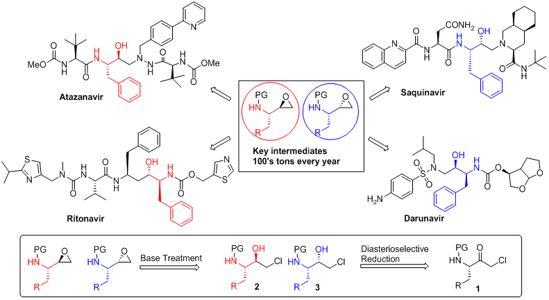 該研究主要通過銠催化的不對稱轉(zhuǎn)移氫化非對映選擇性地構(gòu)筑兩種氨基氯代醇2和3(上圖),然后經(jīng)過簡單的堿處理過程可得到關(guān)鍵的氨基環(huán)氧中間體。與此前一些還原策略相比較,該合成方法極大地提高了合成效率和非對映選擇性(轉(zhuǎn)化數(shù)TON高達(dá)4900,非對映選擇性高達(dá)99:1)。從這兩個關(guān)鍵中間體出發(fā)可以合成一系列的抗HIV蛋白酶抑制劑類藥物,例如阿扎那韋(Atazanavir)、沙奎那韋(Saquinavir)、利托那韋(Ritonavir)和達(dá)蘆那韋(Darunavir)等。