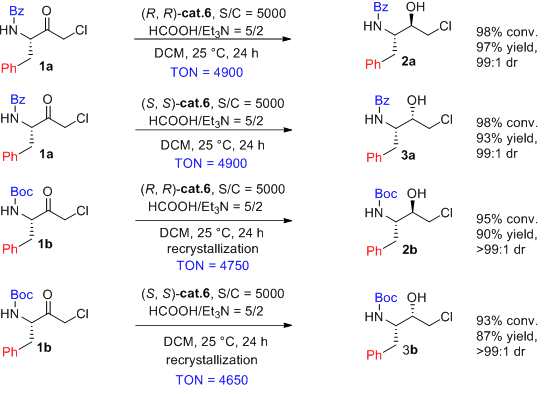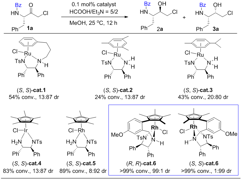 在研究初期,該研究團隊先對近年來發(fā)展的一系列轉(zhuǎn)移氫化催化劑進(jìn)行了系統(tǒng)篩選,最終發(fā)現(xiàn)催化劑(R,R)-cat 6和(S,S)-cat 6表現(xiàn)出最優(yōu)異的活性和非對映選擇性,能夠以大于99:1的選擇性分別得到兩種不同的氨基氯代醇2和3。通過對反應(yīng)條件的進(jìn)一步篩選和優(yōu)化,發(fā)現(xiàn)當(dāng)采用二氯甲烷(DCM)作溶劑時,能夠得到最優(yōu)的反應(yīng)活性和選擇性。