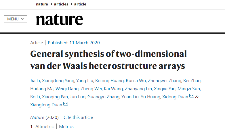 https://www.nature.com/articles/s41586-020-2098-y General synthesis of two-dimensional van der Waals heterostructure arrays(Nature, 2020, DOI: 10.1038/s41586-020-2098-y)