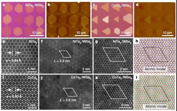 該研究成果開發(fā)了用激光燒蝕等技術(shù)在二維半導(dǎo)體原子晶體基底上定點(diǎn)制造缺陷陣列,金屬納米片在這些缺陷點(diǎn)成核能壘低,優(yōu)先成核??刂瞥〗饘俚纳L條件,最終形成可控的超薄材料/原子級(jí)厚度半導(dǎo)體異質(zhì)結(jié)陣列。這種策略適用于各種不同材料,不限于特定化學(xué)組成或晶格結(jié)構(gòu)。作為演示,研究人員利用原子精確的,接近理想的范德華界面制造出各種二維范德華異質(zhì)結(jié),包括VSe2/WSe2,NiTe2 / WSe2,CoTe2/ WSe2,NbTe2 / WSe2,VS2 / WSe2,VSe2/ MoS2和VSe2 / WS2。生長在二維半導(dǎo)體上的二維金屬性過渡金屬硫化物均具有可設(shè)計(jì)的周期性排列特點(diǎn)和可在指定區(qū)域進(jìn)行調(diào)控的橫向尺寸,最終可以晶體管的溝道尺寸和調(diào)節(jié)電路的形態(tài)。