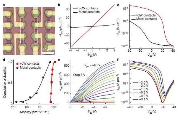 二維半導(dǎo)體有著超薄、對(duì)環(huán)境高度敏感的特性。因此在用傳統(tǒng)熱蒸發(fā)方式制備器件中的金屬電極時(shí)容易損壞原子級(jí)薄的半導(dǎo)體溝道材料。研究人員用二維金屬材料作為電極材料,用氣相沉積合成二維金屬納米片/二維半導(dǎo)體垂直異質(zhì)結(jié)陣列,獲得良好的范德華電極-半導(dǎo)體界面。大量的原子結(jié)構(gòu)表征表明合成的范德瓦爾斯異質(zhì)結(jié)具有原子清晰、接近理想的范德瓦爾斯界面,輪廓分明的摩爾超晶格結(jié)構(gòu)和廣泛可調(diào)的摩爾超晶格周期尺寸。利用這種范德華接觸制備的雙層硒化鎢場效應(yīng)晶體管在溝道長度為1.8 μm時(shí),開態(tài)電流高達(dá)900 μA/μm,這是在所有的已報(bào)道的單層或者雙層過渡金屬二硫族化合物室溫半導(dǎo)體器件中是最大的,為制備可與硅晶體管競爭的二維材料晶體管帶來了希望。測定得到雙層WSe2溝道場效應(yīng)晶體管的半導(dǎo)體載流子遷移率達(dá)到137 cm2V?1s?1,而且分布很窄。這清楚地表明制備的范德華異質(zhì)結(jié)能在原子級(jí)厚度的二維新型半導(dǎo)體上形成高質(zhì)量的電接觸。同時(shí)研究人員在連續(xù)MoS2單層膜上制備了大規(guī)模VSe2/MoS2垂直異質(zhì)結(jié)陣列(>12,000個(gè)),良率達(dá)~99%。實(shí)現(xiàn)了二維范德華金屬/半導(dǎo)體垂直異質(zhì)結(jié)陣列的規(guī)?;?。研究成果為高性能新型器件的量產(chǎn)化提供了新的思路,為二維材料的發(fā)展,特別是在電子學(xué)、光電子學(xué)領(lǐng)域的應(yīng)用奠定了堅(jiān)實(shí)的基礎(chǔ)。