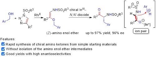 在非手性銠鹽和手性雙氮氧-銦配合物存在下,不同取代的三氮唑可與多種類型的苯甲醇類底物發(fā)生反應(yīng),較高收率和高對映選擇性地得到一系列a-氨基酮產(chǎn)物,最優(yōu)結(jié)果高達97%的收率和96%的對映選擇性。通過產(chǎn)物單晶、控制實驗以及動力學(xué)研究,我們認為該重排反應(yīng)經(jīng)歷了離子對機理。