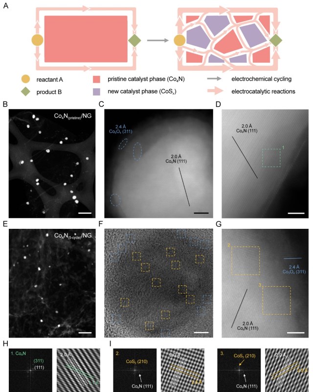 圖1. 預(yù)催化劑的原位電化學(xué)相演變的示意圖和對應(yīng)的電子顯微圖像。富金屬化合物作為預(yù)催化劑(以Co4N為例)在工作電池中經(jīng)歷原位“馬賽克化”相演變的過程示意圖。