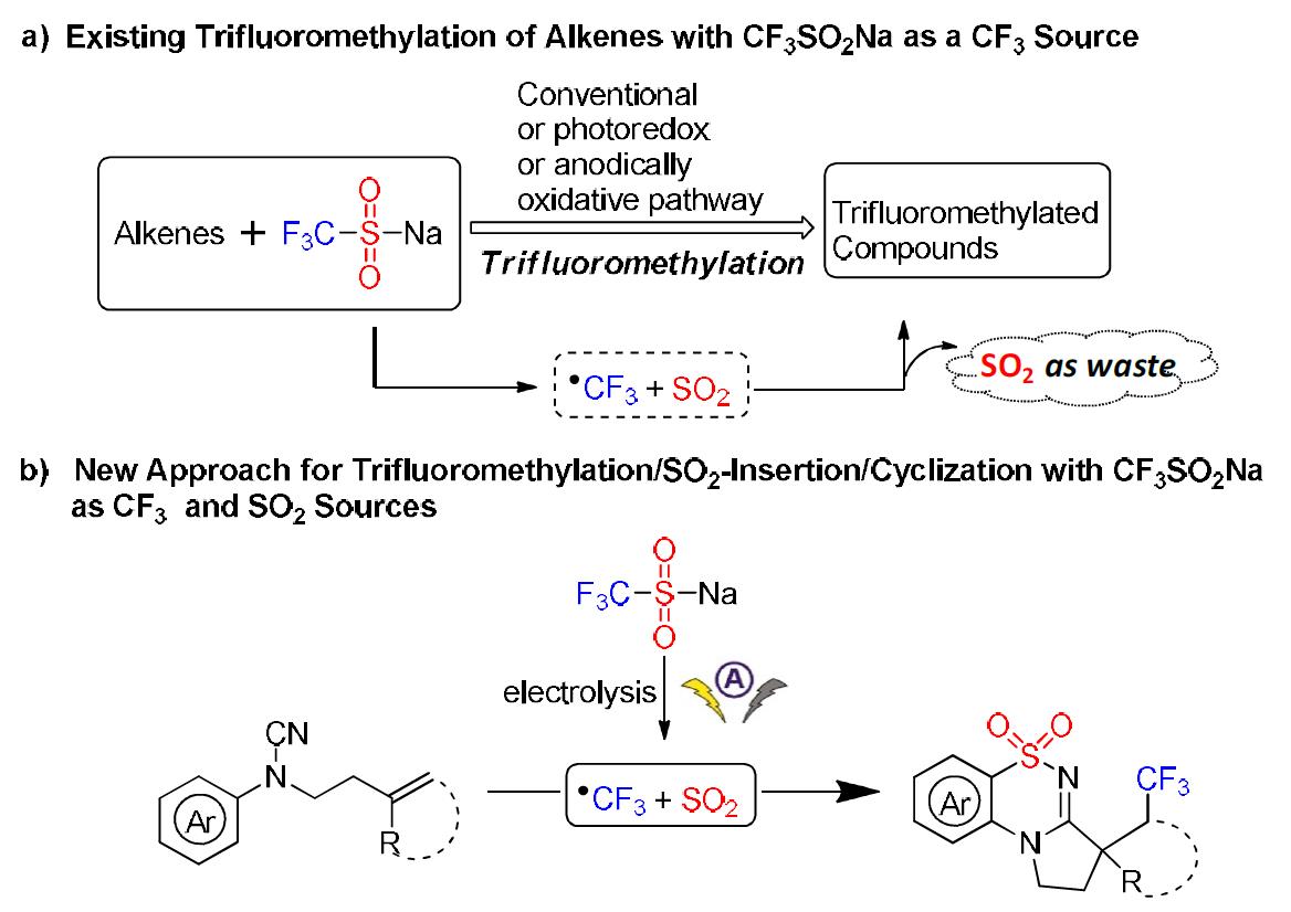 三氟甲基取代的有機(jī)氟化合物在醫(yī)藥、農(nóng)藥、材料等領(lǐng)域具有廣泛應(yīng)用。因此,發(fā)展高效、實(shí)用的合成方法制備三氟甲基取代的有機(jī)化合物具有重要的研究?jī)r(jià)值。Langlois試劑(CF3SO2Na)作為一類(lèi)重要的三氟甲基化試劑,廣泛用于烯烴、芳烴等的三氟甲基化反應(yīng)。然而,該類(lèi)試劑僅作為三氟甲基給體,反應(yīng)伴隨釋放的SO2作為反應(yīng)廢棄物,并未被有效利用。近日,寮渭巍教授課題組通過(guò)電化學(xué)方式,首次實(shí)現(xiàn)了Langlois試劑作為三氟甲基及二氧化硫給體與N-芳基氰胺反應(yīng),通過(guò)三氟甲基化/SO2插入/串聯(lián)環(huán)化原子經(jīng)濟(jì)性的合成了三氟甲基取代的磺內(nèi)酰亞胺衍生物。