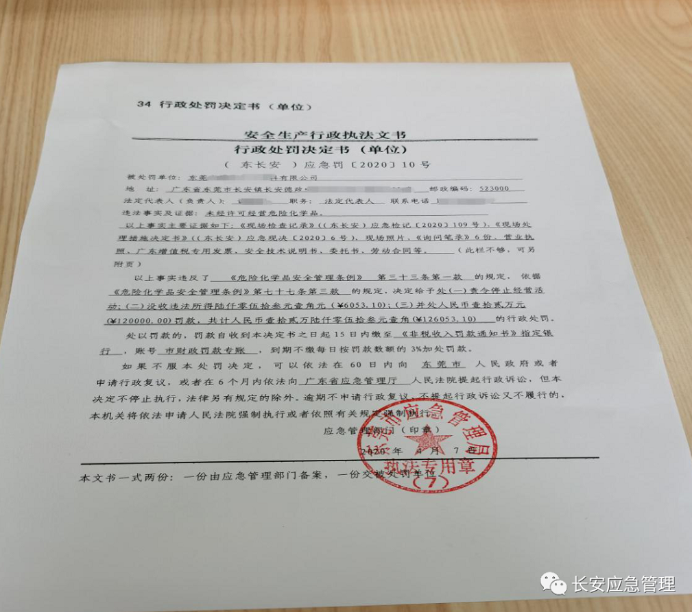 2020年3月10日,東莞市應(yīng)急管理局長(zhǎng)安分局執(zhí)法人員,對(duì)東莞市某化工材料有限公司進(jìn)行執(zhí)法檢查,經(jīng)檢查發(fā)現(xiàn)該企業(yè)銷售的產(chǎn)品中含有不在許可范圍內(nèi)的危險(xiǎn)化學(xué)品,屬于未經(jīng)許可經(jīng)營(yíng)危險(xiǎn)化學(xué)品。該公司行為違反了《危險(xiǎn)化學(xué)品安全管理?xiàng)l例》第三十三條第一款,執(zhí)法人員依據(jù)《危險(xiǎn)化學(xué)品安全管理?xiàng)l例》第七十七條第三款,責(zé)令其立即停止經(jīng)營(yíng)活動(dòng),處罰款人民幣12萬(wàn)元并沒(méi)收違法所得人民幣6053.1元。