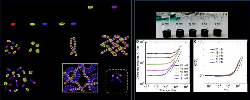生物組織是由蛋白質(zhì)砌塊組裝得到的半柔性(Semiflexible)生物微絲交織而成的三維網(wǎng)絡(luò)結(jié)構(gòu),在應(yīng)對外界機(jī)械力的刺激時,會表現(xiàn)出獨特的應(yīng)變增強(qiáng)特性(Strain-stiffening),以保護(hù)機(jī)體免受外界應(yīng)力的傷害。長期以來,人們利用小分子砌塊,通過超分子組裝的方式,制備出了一系列類似生物組織的超分子水凝膠材料,并在生物醫(yī)藥、仿生、光電等領(lǐng)域表現(xiàn)出巨大的應(yīng)用前景。然而,生物組織所表現(xiàn)出的應(yīng)變增強(qiáng)特性在人工合成型超分子水凝膠材料中極其罕見。