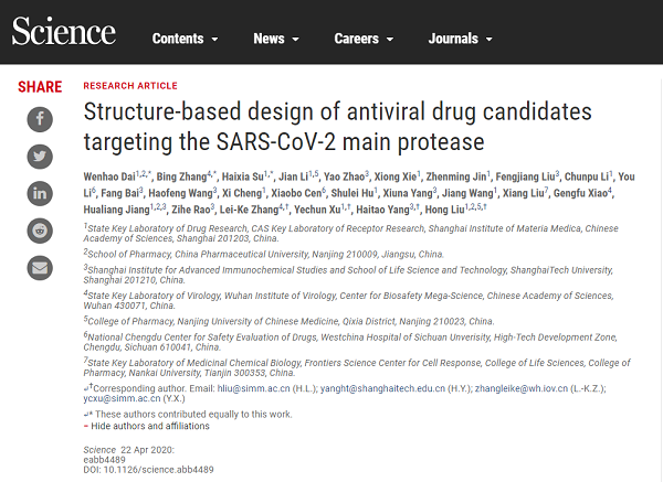 中科院上海藥物所與中國(guó)藥科大學(xué)聯(lián)合培養(yǎng)博士生戴文豪、上??萍即髮W(xué)免疫化學(xué)研究所副研究員張兵博士、武漢病毒所碩士研究生姜夏銘和中科院上海藥物所博士生蘇海霞為本文的共同第一作者。