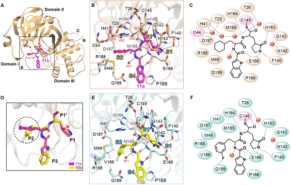 化合物11a和11b與SARS-CoV-2主蛋白酶復(fù)合物的三維結(jié)構(gòu)顯示這兩個(gè)化合物均占據(jù)底物結(jié)合口袋,其中化合物的醛基和蛋白酶催化位點(diǎn)145位半胱氨酸殘基形成共價(jià)鍵,牢牢地將其鎖住。高分辨的復(fù)合物結(jié)構(gòu)信息不僅展示了化合物11a和11b與主蛋白酶精確的互作模式,還揭示了化合物抑制病毒蛋白酶的分子機(jī)制。
