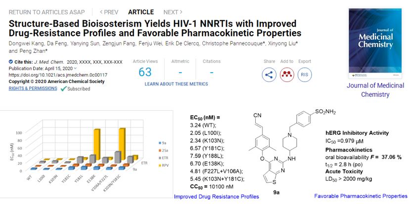 上述研究成果已連續(xù)在Journal of Medicinal Chemistry發(fā)表2篇文章(J Med Chem.2020,63, 1298-1312;J Med Chem.2020 Apr 15. doi: 10.1021/acs.jmedchem.0c00117.),第一作者均為山東大學特別資助類博士后康東偉;山東大學藥學院劉新泳教授、展鵬副教授均為兩篇文章的共通訊作者;羅格斯大學Eddy Arnold教授及比利時魯汶大學Christophe Pannecouque教授分別為兩篇論文的共同通訊作者。