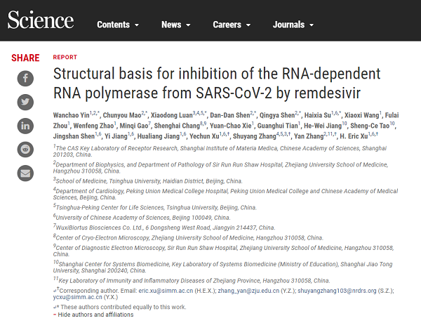 中國科學院上海藥物研究所徐華強課題組博士后尹萬超為論文第一作者,浙江大學博士后毛春友、研究助理沈丹丹和博士后沈慶亞,清華大學醫(yī)學院博士生欒曉東以及上海藥物研究所博士生蘇海霞為論文的共同第一作者,中國科學院上海藥物研究所徐華強研究員、浙江大學張巖教授、北京協(xié)和醫(yī)院張抒揚教授和上海藥物研究所許葉春研究員為共同通訊作者。中國科學院上海藥物研究所為第一完成單位。此項工作獲得了浙江大學電鏡中心和上海藥物所電鏡中心的大力支持。中科院上海藥物所蔣華良和沈敬山課題組在瑞德西韋三磷酸活性成分合成方面給予及時、重要的關(guān)鍵貢獻。