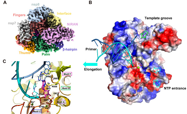 新冠肺炎病毒的RNA復制酶結(jié)合RNA和抑制劑瑞德西韋復合物的冷凍電鏡結(jié)構(gòu)。(A),復合物結(jié)構(gòu)的冷凍電鏡電子密度圖;(B)復合物結(jié)構(gòu)活性部位的表面視圖;(C)RNA復制酶活性位點的近距離視圖,顯示了與瑞德西韋相互作用的關(guān)鍵殘基和堿基。