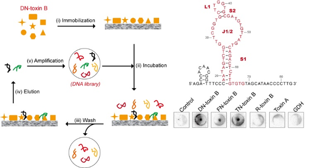 針對(duì)以上難點(diǎn),大連理工大學(xué)劉猛課題組首先開(kāi)發(fā)了新型核酸適配體體外篩選方法,得到了可以識(shí)別毒素B降解片段(DN-toxin B)的適配體,兩者的結(jié)合能力在nM級(jí)別。此外,該適配體可以結(jié)合天然毒素B(FN-toxin B)和熱處理的毒素B(TN-toxin B),對(duì)于重組型毒素B(R-toxin B)、毒素A(toxin A)和谷氨酸脫氫酶(GDH)等表現(xiàn)出良好的選擇性。進(jìn)一步研究發(fā)現(xiàn),適配體識(shí)別的毒素B降解片段的分子量在50 kDa左右。