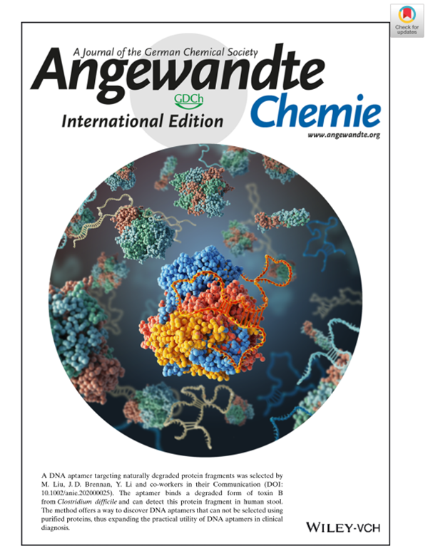 該成果在線發(fā)表于Angewandte Chemie International Edition,并被選為當(dāng)期熱點(diǎn)文章(hot paper)和封底文章(back cover)。大連理工大學(xué)環(huán)境學(xué)院為論文第一通訊單位,加拿大McMaster大學(xué)生物界面研究所John D. Brennan教授和生物化學(xué)和生物醫(yī)學(xué)系Yingfu Li教授為文章的共同通訊作者。