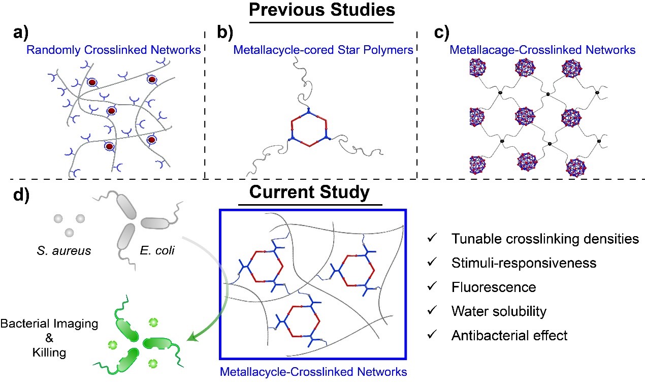 針對這一問題,西安交通大學材料學院張明明教授課題組在前期構筑的熒光金屬大環(huán)的基礎上,提出一種利用熒光金屬大環(huán)交聯聚合物從而形成聚合物網絡的策略。這類超分子網絡很好地保持了金屬大環(huán)的熒光性能以及抗菌性,而且由于聚合物的引入,提高了其水溶性以及生物利用率,可以同時實現細菌的成像以及殺滅??蒲腥藛T詳細地研究了不同的交聯密度對于該類聚合物網絡的紫外吸收、熒光發(fā)射、溶劑化轉變溫度以及模量的影響,表明可以通過精確調控聚合物網絡的交聯密度來調節(jié)其功能以及應用,這一研究不僅為拓撲結構交聯的聚合物網絡提供了一種方法,還開拓了這類聚合物網絡的生物應用,促進了拓撲結構交聯的聚合物網絡的發(fā)展。