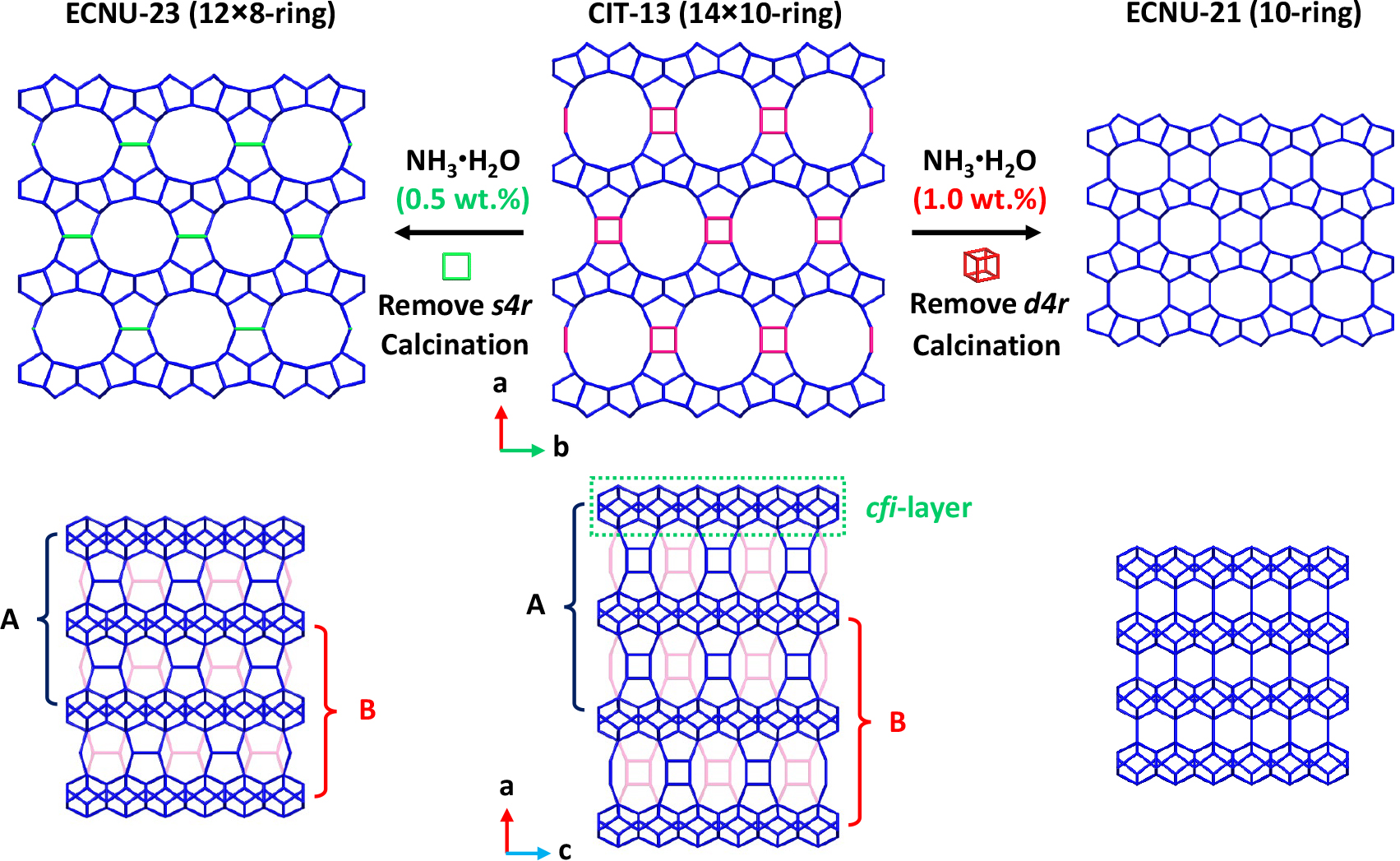 圖2. CIT-13硅鍺分子篩結(jié)構(gòu)修飾創(chuàng)制新結(jié)構(gòu)分子篩ECNU-21和ECNU-23