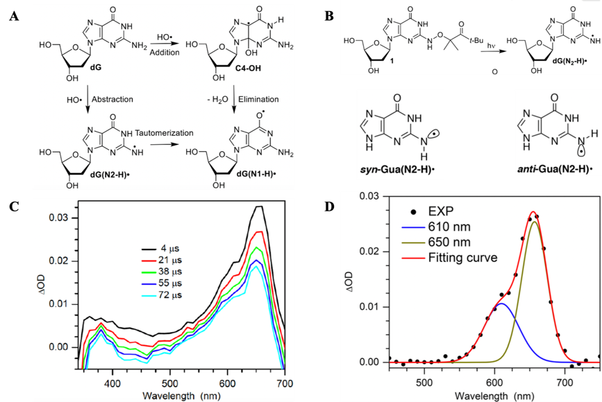 圖A: OH?與G堿基反應生成dG(N1-H)?自由基的兩種反應機制;圖B:光誘導前體1生成dG(N2-H)?及自由基的anti-和syn-兩種構像; 圖C: 激光光解典型時刻的瞬態(tài)紫外-可見吸收光譜; 圖D: 吸收峰分別在610 nm和650 nm的高斯線型擬合anti-和syn-構像的dG(N2-H)?瞬態(tài)吸收光譜。