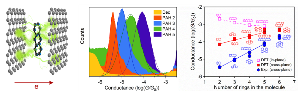 洪文晶教授實驗室通過自主發(fā)展能夠精準(zhǔn)構(gòu)筑和表征單分子器件的科學(xué)儀器技術(shù),實現(xiàn)了兩片單層石墨烯電極間距的精確調(diào)控,以此將單個平面有機分子連接在兩片單層石墨烯電極之間,從而構(gòu)筑了具有三明治結(jié)構(gòu)、導(dǎo)電通道長度僅為單原子層厚度的單分子范德華異質(zhì)結(jié)器件。進一步選用9種多環(huán)芳烴化合物構(gòu)筑出了一系列單分子二維范德華異質(zhì)結(jié),并實現(xiàn)了對該類器件的電輸運性質(zhì)的系統(tǒng)電學(xué)表征。與傳統(tǒng)的單分子電子器件所通過面內(nèi)輸運(in-plane)不同的是,單分子二維范德華異質(zhì)結(jié)的電輸運是采用層間輸運(cross-plane transport)。雖然導(dǎo)電通道僅有單原子層厚度,但是通過對分子共軛程度乃至拓撲結(jié)構(gòu)的精細調(diào)節(jié)仍然可以顯著改變單分子電子器件的電子輸運能力。該工作所發(fā)展的構(gòu)筑技術(shù),還可以拓展到其他二維材料和分子體系,從而為新型單分子二維材料范德華異質(zhì)結(jié)器件的設(shè)計、構(gòu)筑和表征,提供了獨特的表征技術(shù)和研究方法。