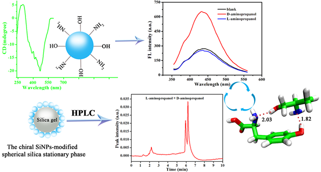 中國(guó)科學(xué)院西北特色植物資源化學(xué)重點(diǎn)實(shí)驗(yàn)室邱洪燈團(tuán)隊(duì),近期發(fā)展了一種利用手性熒光硅納米顆粒(chiral-SiNPs)高效識(shí)別L/D-氨基丙醇及分析對(duì)映體純度的策略。如圖1所示,研究人員分別在chiral-SiNPs溶液中加入L-氨基丙醇和D-氨基丙醇之后,D-氨基丙醇對(duì)chiral-SiNPs的熒光起到了增強(qiáng)作用,而L-氨基丙醇不會(huì)影響chiral-SiNPs的熒光信號(hào)。隨后,利用密度泛函理論(DFT)對(duì)chiral-SiNPs的手性前體與L/D-氨基丙醇之間的相互作用情況進(jìn)行了計(jì)算,并在高效液相色譜中研究了chiral-SiNPs修飾色譜固定相對(duì)L/D-氨基丙醇的分離性能與分離機(jī)理。最終確定了chiral-SiNPs識(shí)別L-/D氨基丙醇的機(jī)理是由chiral-SiNPs和D-氨基丙醇的作用力大于與L-氨基丙醇的作用力所致。