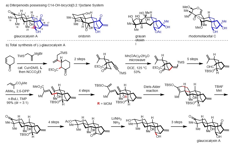 二萜類天然產(chǎn)物由于具有復(fù)雜的化學(xué)結(jié)構(gòu)和良好的生物活性,其全合成一直是合成化學(xué)的熱門研究領(lǐng)域。然而,具有14-羥基[3.2.1]橋環(huán)結(jié)構(gòu)的二萜(圖a),由于其連續(xù)手性中心多、合成挑戰(zhàn)性更高,而鮮有全合成報(bào)道。藍(lán)萼甲素(Glaucocalyxin A)則是該類二萜的代表分子之一,其不僅具有良好的抗腫瘤與抗炎活性,而且結(jié)構(gòu)復(fù)雜,包含四個(gè)全碳環(huán)和7個(gè)連續(xù)的手性中心,至今沒有全合成報(bào)道。