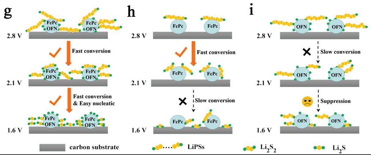 Figure 2. The schematic diagrams to show the adsorption and conversion mechanisms of LiPSs at the surface of (g) CNTs-S/Gh/FePc+OFN cathode, (h) CNTs-S/Gh/FePc cathode, (i) CNTs-S/Gh/OFN cathode, respectively. The yellow and green balls represent S and Li atoms, respectively.