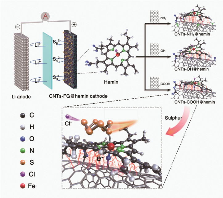Figure 1. Schematic configuration of a Li–S battery based on three CNTs-FG@hemin cathodes (FG= NH2, OH, COOH), and the mechanism of polysulfides adsorption at the CNTs-COOH@hemin cathode.