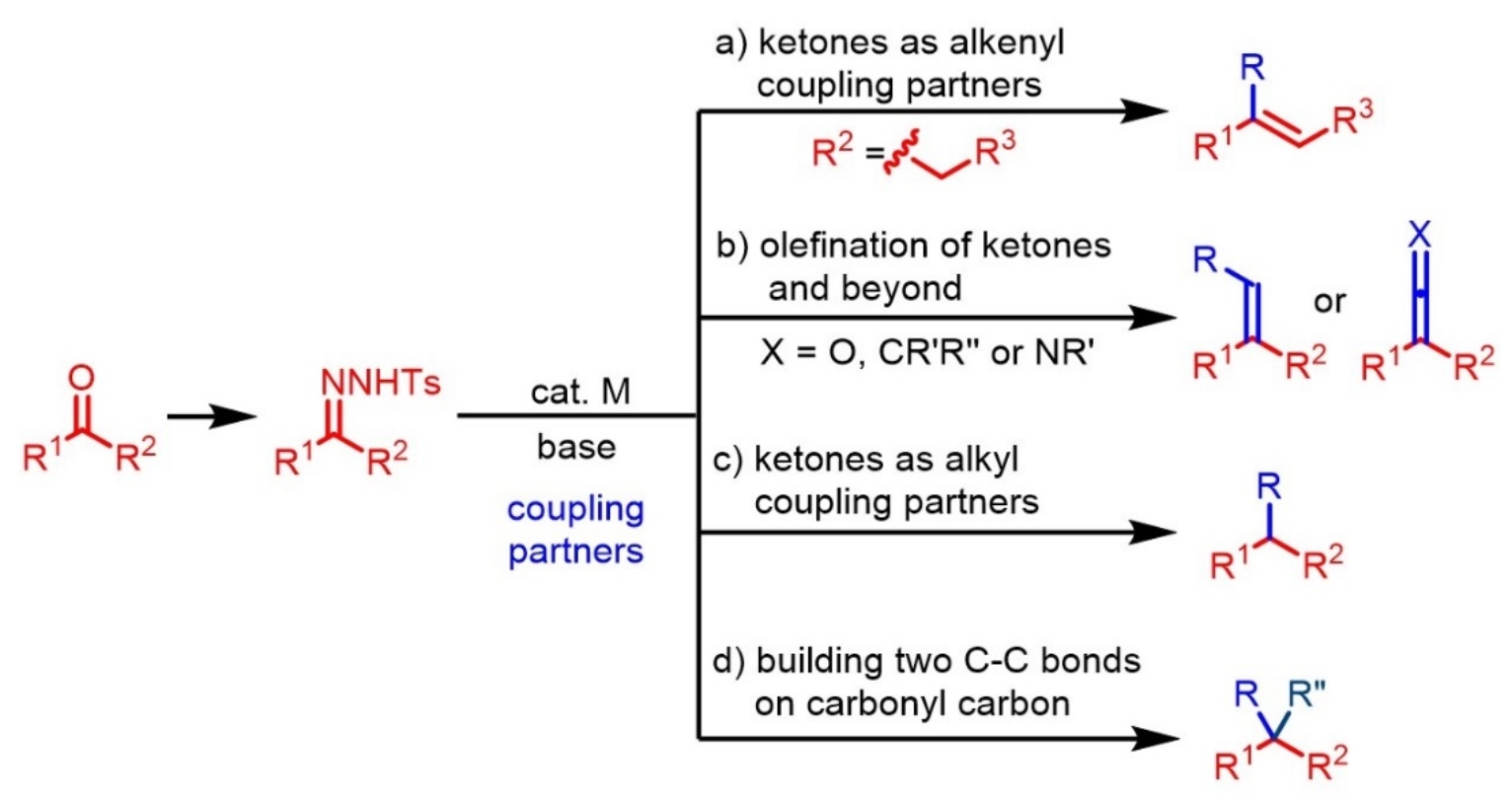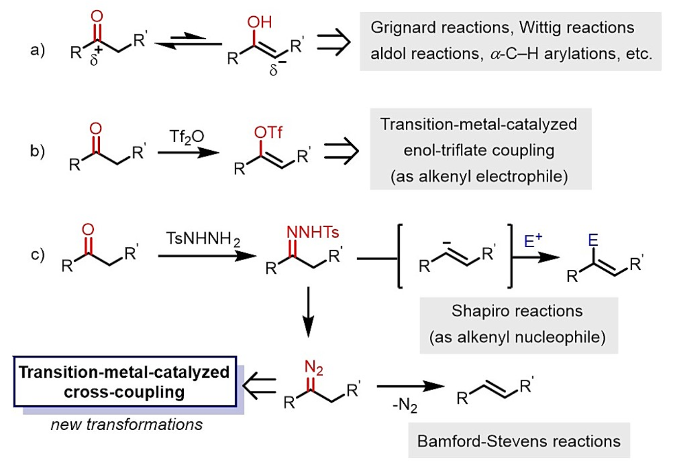 醛酮等羰基化合物作為最基本的化合物在有機合成中扮演著非常重要的角色。醛酮豐富的反應(yīng)活性主要來源于羰基碳的親電性和α-氫的酸性。例如,有機合成中應(yīng)用非常廣泛的反應(yīng),包括格式試劑加成反應(yīng)、魏悌息反應(yīng)、羥醛縮合反應(yīng)和α-碳?xì)滏I烷基化、芳基化反應(yīng)等等,都與醛酮的這些性質(zhì)相關(guān)。如果將醛酮轉(zhuǎn)化為相應(yīng)的三氟甲磺酸烯醇酯(-OTf),則其可以作為烯基親電試劑在過渡金屬催化下參與偶聯(lián)反應(yīng)。這是一類已發(fā)展完善的間接利用醛酮作為偶聯(lián)組分的方法。此外,通過將醛酮與對甲苯磺酰肼(TsNHNH2)簡單縮合得到的對甲苯磺酰腙(=NNHTs),也是一類非常重要的合成子,其可以經(jīng)由Shapiro反應(yīng)和Bamford-Stevens反應(yīng)得到官能團化的烯烴。特別是Shapiro反應(yīng)可以將酮轉(zhuǎn)化為烯基親核試劑來參與反應(yīng),這一特殊的轉(zhuǎn)化模式在有機合成中得到了很多應(yīng)用,例如,該反應(yīng)是紫杉醇全合成中的關(guān)鍵步驟之一。