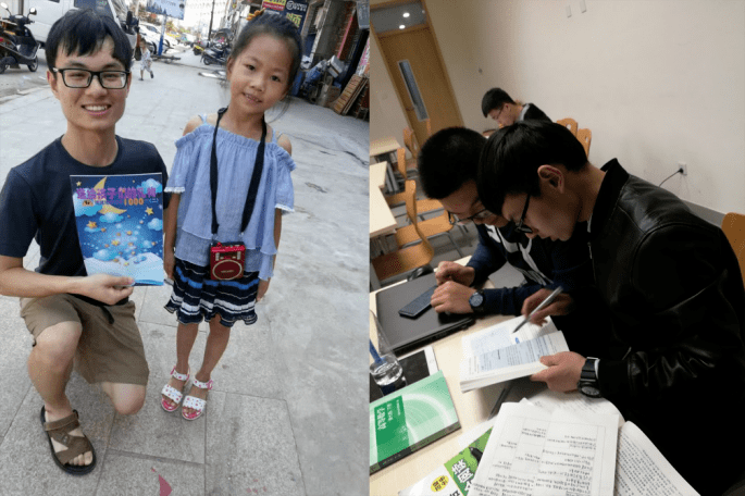 圖為魯楊參與“送故事下鄉(xiāng)”活動(dòng)和為同學(xué)輔導(dǎo)功課