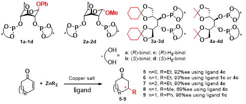 圖式1. 碳水化合物衍生的手性亞磷酸酯配體及在銅催化有機(jī)鋅對烯酮的不對稱1, 4-共軛加成反應(yīng)中的應(yīng)用。