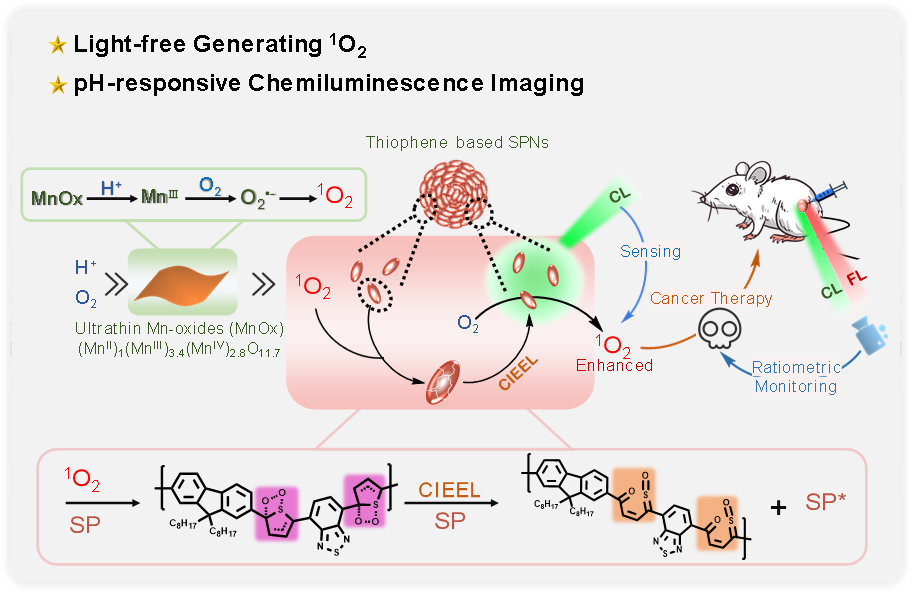 論文信息:Lu C., Song G.*, et al,Light-free Generation of Singlet Oxygen through Manganese - Thiophene Nanosystems for pH-responsive Chemiluminescence Imaging and Tumor Therapy,Chem, 2020, DOI,10.1016/j.chempr.2020.06.024